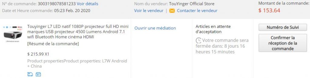 J’ai commandé le 20 février le projecteur Touyinger L7, et il est arrivé le 12 mars. Le projecteur venait bien de Chine. Il est disponible en Chine et en Russie, mais la Russie n’est pas un point de départ pour nos colis. Il a donc fallu 21 jours pour que le projo arrive, ce qui correspond au délai habituel de 3 semaines.