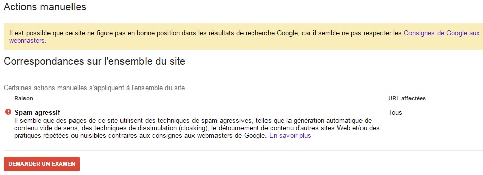 Il a donc fallu un peu plus de 24 heures à Google pour me faire parvenir le premier message officiel. Le premier message apparaît dans la Google Webmaster Tools (Search console) interface sous la mention action manuelle.